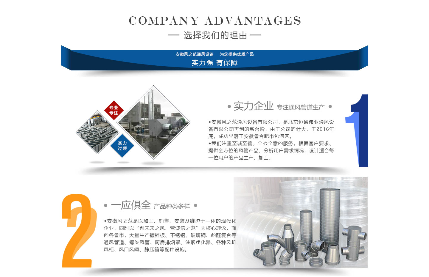 安徽風之范通風設備有限公司,是北京恒通偉業(yè)通風設備有限公司再創(chuàng)的新臺階,多年來,公司員工憑著“誠信敬業(yè)、團結拼搏、勇于開拓、務實進取”的企業(yè)精神,先后承接了多項重點工程項目,使公司健康穩(wěn)步發(fā)展。現(xiàn)由于公司的壯大,業(yè)務的拓展,又于2016年底,成功坐落于安徽省合肥市包河區(qū)。本公司生產(chǎn)設備精良,技術力量雄厚,質(zhì)保體系完善!讓用戶體驗到,貼心的服務,無憂的售后!風之范是以加工、銷售、安裝及維護于一體的現(xiàn)代化企業(yè),同時以“創(chuàng)未來之風、營誠信之范”為核心理念,面向全國各省市,大量生產(chǎn)鍍鋅板、不銹鋼、玻璃鋼、酚醛復合等通風管道、螺旋風管、廚房排煙罩、油煙凈化器、各種風機風柜、風口風閥、靜壓箱等配件設施。廣泛承接商場、工廠、酒店、寫字樓、地下室等,消防排煙工程、除塵凈化工程、室內(nèi)通風工程、暖通空調(diào)工程、廚房排煙凈化工程。我們力求上進,追求,歡迎各界人士技術指導,經(jīng)濟合作,共創(chuàng)美好明天!